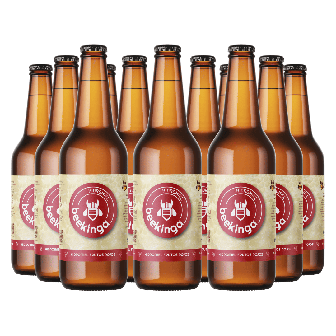 Compra doce botellines de Hidromiel Beekinga Frutos Rojos de 0.33L, nuestro hidromiel realizado con agua, miel y frutos rojos. El grado de alcohol es de un 5% aproximadamente. Un hidromiel perfecto para tomar como aperitivo o como acompañamiento de platos y postres.